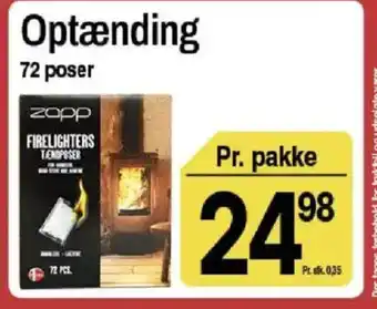 Dette tilbud er tilgængeligt i forskellige butikker, gennemse alle produkter for at finde det billigste Optænding. Hvis du gerne vil vide om denne vare er billigere i en anden butik, tjek kategorien 'Dagligvarer'. Du vil måske også finde disse tilbud interessant: Optændingspinde LUX 3,7 kg, Optændingsblokke el. Turbo Lightere & Optændingsblokke.