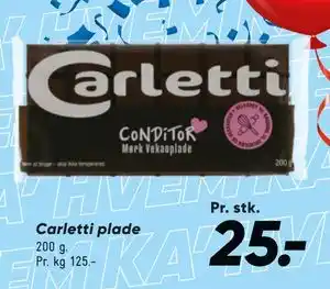 Prisen på Carletti plade kan findes øverst på siden sammen med datoerne, hvor tilbuddet er tilgængeligt. Du kan også kigge på prisen i den nuværende Bilka tilbudsavis eller på Bilkas hjemmeside. Kampagnetilbud sikrer, at du køber Bilkas varer til den laveste pris.