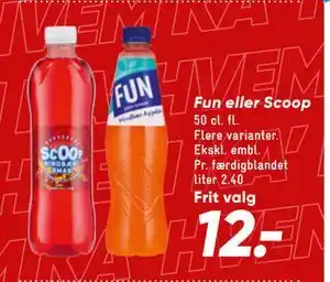 Dette tilbud er tilgængeligt i forskellige butikker, gennemse alle produkter for at finde det billigste Fun eller Scoop. Hvis du gerne vil vide om denne vare er billigere i en anden butik, tjek kategorien 'Dagligvarer'. Du vil måske også finde disse tilbud interessant: Fun eller Scoop læskedrik*, Fun eller SCOOP 50 cl & Fun eller SCOOP Ex. pant.
