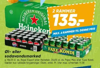 a 18x33 cl. ds. Royal Export eller Heineken. 24x33 cl. ds. Pepsi Max eller Faxe Kondi. Gælder kun lukkede forpakninger.