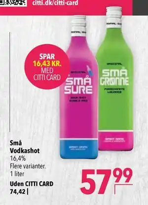 Citti har et stort udvalg af varer udover Små Vodkashot. Hold øje med den ugentlige Citti tilbudsavis for at finde de bedste tilbud og kampagner. Udover Små Vodkashot, kan du også finde følgende tilbud: Små, Små Bats & Små Shots.