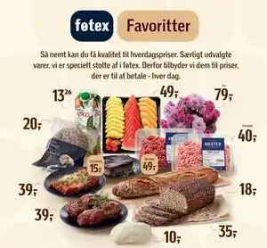 Prisen på føtex Favoritter kan findes øverst på siden sammen med datoerne, hvor tilbuddet er tilgængeligt. Du kan også kigge på prisen i den nuværende Føtex tilbudsavis eller på Føtexs hjemmeside. Kampagnetilbud sikrer, at du køber Føtexs varer til den laveste pris.