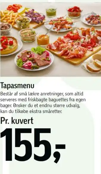 Prisen på Tapasmenu kan findes øverst på siden sammen med datoerne, hvor tilbuddet er tilgængeligt. Du kan også kigge på prisen i den nuværende Føtex tilbudsavis eller på Føtexs hjemmeside. Kampagnetilbud sikrer, at du køber Føtexs varer til den laveste pris.