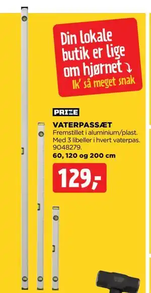 Prisen på VATERPASSÆT kan findes øverst på siden sammen med datoerne, hvor tilbuddet er tilgængeligt. Du kan også kigge på prisen i den nuværende Jem & fix tilbudsavis eller på jem & fixs hjemmeside. Kampagnetilbud sikrer, at du køber jem & fixs varer til den laveste pris.