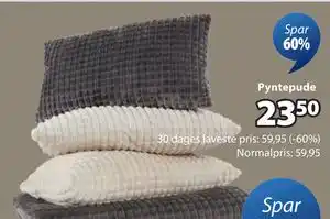 Prisen på Pyntepude kan findes øverst på siden sammen med datoerne, hvor tilbuddet er tilgængeligt. Du kan også kigge på prisen i den nuværende JYSK tilbudsavis eller på JYSKs hjemmeside. Kampagnetilbud sikrer, at du køber JYSKs varer til den laveste pris.