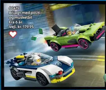 Prisen på Biljagt med politi og muskelbil kan findes øverst på siden sammen med datoerne, hvor tilbuddet er tilgængeligt. Du kan også kigge på prisen i den nuværende Lego tilbudsavis eller på Legos hjemmeside. Kampagnetilbud sikrer, at du køber Legos varer til den laveste pris.