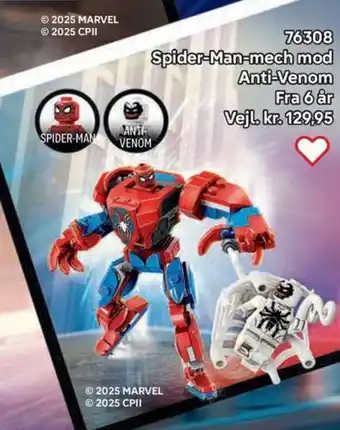 Dette tilbud er tilgængeligt i forskellige butikker, gennemse alle produkter for at finde det billigste Spider-Man-mech mod Anti-Venom. Hvis du gerne vil vide om denne vare er billigere i en anden butik, tjek kategorien 'Legetøj'. Du vil måske også finde disse tilbud interessant: 76308 LEGO SUPER HEROES MARVEL SPIDER-MAN-MECH MOD ANTI-VENOM, DKK 129.95, Spider-Man mod Venom-muskelbil & LEGO Marvel Spider-Man mod Venom-muskelbil.