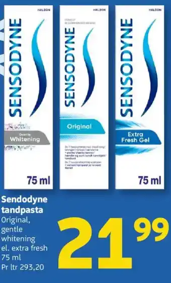 Dette tilbud er tilgængeligt i forskellige butikker, gennemse alle produkter for at finde det billigste Sendodyne tandpasta. Hvis du gerne vil vide om denne vare er billigere i en anden butik, tjek kategorien 'Dagligvarer'. Du vil måske også finde disse tilbud interessant: Colgate tandpasta, Zendium Tandpasta & Zendium Tandpasta.