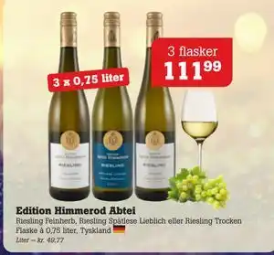 Dette tilbud er tilgængeligt i forskellige butikker, gennemse alle produkter for at finde det billigste Edition Himmerod Abtei. Hvis du gerne vil vide om denne vare er billigere i en anden butik, tjek kategorien 'Grænsehandel'. Du vil måske også finde disse tilbud interessant: ABTEI HIMMEROD 2023/2024, DKK 39.99, Edition Riesling, DKK 29.95 & Amicale Limited edition 15%.