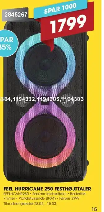 Prisen på Feel hurricane 250 festhøjttaler kan findes øverst på siden sammen med datoerne, hvor tilbuddet er tilgængeligt. Du kan også kigge på prisen i den nuværende Punkt1 tilbudsavis eller på Punkt1s hjemmeside. Kampagnetilbud sikrer, at du køber Punkt1s varer til den laveste pris.