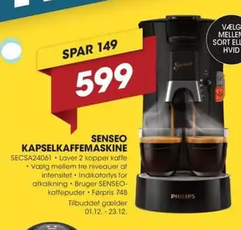 Prisen på Senseo kapselkaffemaskine kan findes øverst på siden sammen med datoerne, hvor tilbuddet er tilgængeligt. Du kan også kigge på prisen i den nuværende Punkt1 tilbudsavis eller på Punkt1s hjemmeside. Kampagnetilbud sikrer, at du køber Punkt1s varer til den laveste pris.
