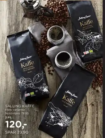 Prisen på SALLING KAFFE kan findes øverst på siden sammen med datoerne, hvor tilbuddet er tilgængeligt. Du kan også kigge på prisen i den nuværende Salling tilbudsavis eller på Sallings hjemmeside. Kampagnetilbud sikrer, at du køber Sallings varer til den laveste pris.