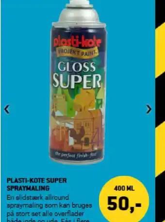 Prisen på Plasti-kote super spraymaling kan findes øverst på siden sammen med datoerne, hvor tilbuddet er tilgængeligt. Du kan også kigge på prisen i den nuværende XL-BYG tilbudsavis eller på XL-BYGs hjemmeside. Kampagnetilbud sikrer, at du køber XL-BYGs varer til den laveste pris.