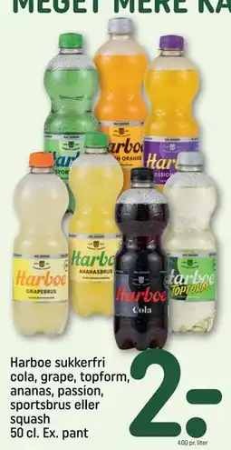 REMA 1000 Harboe sukkerfri cola, grape, topform, ananas, passion, sportsbrus eller squash tilbud