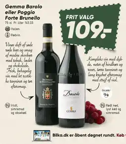 Bilka Gemma Barolo eller Poggio Forte Brunello tilbudGemma Barolo eller Poggio Forte Brunello 75 clBilka109,00 kr.24 april 202630 april 2026