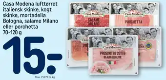 | Casa Modena lufttørret italiensk skinke, kogt skinke, mortadella Bologna, salame Milano eller porchetta 70-120 g | REMA 1000 | 17,95 kr. | 15,00 kr. | 2,95 kr. Rabat | 24 marts 2024 | 30 marts 2024 | |