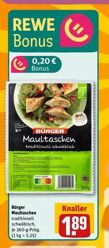 | Bürger Maultaschen 360 g | REWE DE | | 1,49 kr. | | 21 juli 2025 | 27 juli 2025 |