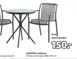 2JYSK RADSTRUP cafébord tilbudRADSTRUP cafébord 1 stk.JYSK150,00 kr.13 marts 202626 marts 2026 Se tilbud