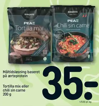 | Måltidsløsning baseret på ærteprotein, Tortilla mix eller chili sin carne | REMA 1000 | 35,00 kr. | 13 marts 2022 | 19 marts 2022 | |||