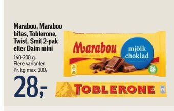 | Marabou, Marabou bites, Toblerone, Twist, Smil 2-pak eller Daim mini | Føtex | 28,00 kr. | 07 juli 2023 | 20 juli 2023 | |||