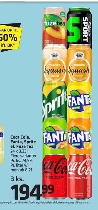 | Coca Cola, Fanta, Sprite, Fuze Tea, Tuborg Squash el. Carlsberg Sport | Fleggaard | 69,00 kr. | 19 marts 2024 | 02 april 2024 | |||