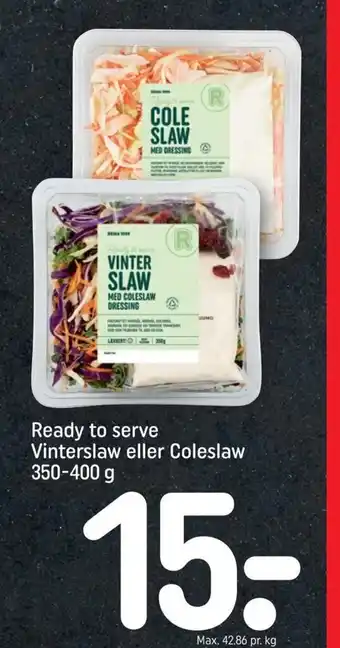 | Ready to serve Coleslaw eller Vinterslaw 350-400 g | REMA 1000 | 20,00 kr. | 01 januar 2024 | 06 januar 2024 | |||