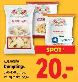 2Lidl KULJANKA Dumplings tilbudKULJANKA Dumplings 350-450 gLidl20,00 kr.18 januar 202624 januar 2026 Se tilbud