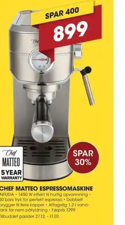 | Chef MATTEO Espressomaskine Lav de mest lækre espressoer | Power | 1.299,00 kr. | 699,00 kr. | SPAR 600,- | 02 december 2025 | 24 december 2025 | |