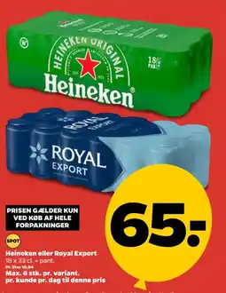 1Netto Heineken eller Royal Export tilbudHeineken eller Royal Export 18 x 33 clNetto65,00 kr.07 marts 202613 marts 2026 Se tilbud