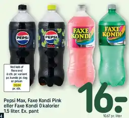 | Pepsi Max eller Faxe Kondi 1.5 liter. Ex. pant | REMA 1000 | 20,00 kr. | 12,00 kr. | 8,00 kr. Rabat | 09 februar 2025 | 15 februar 2025 | |