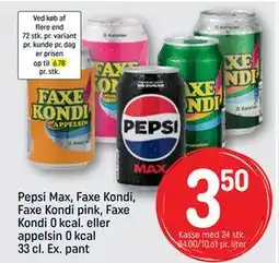 | Faxe kondi, pepsi max, faxe kondi 0 kcal. eller appelsin 0 kcal. 33 cl. ex. pant | REMA 1000 | 6,50 kr. | 3,00 kr. | 3,50 kr. Rabat | 17 december 2023 | 23 december 2023 | |