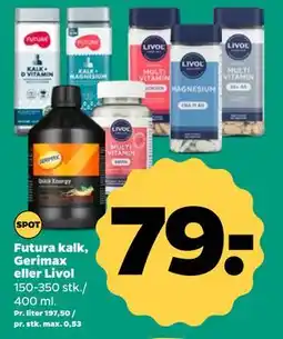 Føtex Livol, Futura vitaminer/ mineraler eller Gerimax tilbudLivol, Futura vitaminer/ mineraler eller Gerimax 30-385 stk.Føtex85,00 kr.27 december 202501 januar 2026