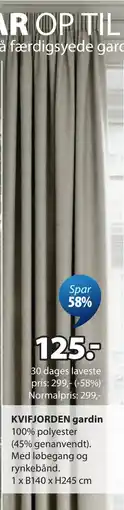 | KVIFJORDEN gardin 1 stk. | JYSK | 299,00 kr. | 125,00 kr. | 174,00 kr. Rabat | 17 april 2026 | 23 april 2026 | |