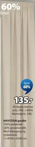 | HAVSTEIN gardin 1 stk. | JYSK | 349,00 kr. | 135,00 kr. | 214,00 kr. Rabat | 17 april 2026 | 23 april 2026 | |