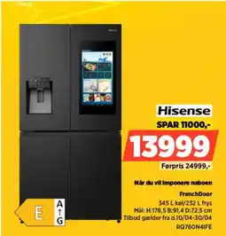 | Hisense French Door RQ760N4IFE | Power | 24.999,00 kr. | 13.999,00 kr. | 11.000,00 kr. Rabat | 10 april 2026 | 30 april 2026 | |