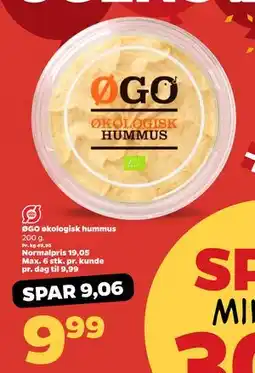 1Netto ØGO økologisk hummus tilbudØGO økologisk hummus 200 gNetto19,05 kr.9,99 kr.9,06 kr. Rabat28 februar 202606 marts 2026 Se tilbud