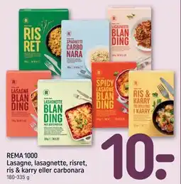 REMA 1000 REMA 1000 Lasagne, lasagnette, risret, ris og karry eller carbonara tilbudREMA 1000 Lasagne, lasagnette, risret, ris og karry eller carbonara 180 - 321 gREMA 100014,00 kr.12 april 202618 april 2026