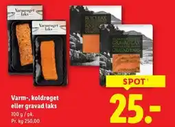 | Varm-, koldrøget eller gravad laks 100 g | Lidl | 25,00 kr. | 18 januar 2026 | 24 januar 2026 | |||