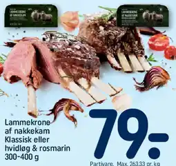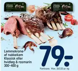 | Lammekrone af nakkekam - Klassisk eller hvidløg & rosmarin 300-400 g | REMA 1000 | 79,00 kr. | 08 marts 2026 | 14 marts 2026 | |||