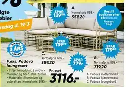 | Padova loungesæt 1 stk. | Bilka | 3.895,00 kr. | 3.116,00 kr. | 779,00 kr. Rabat | 06 marts 2026 | 19 marts 2026 | |