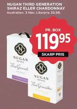MENY NUGAN THIRD GENERATION SHIRAZ ELLER CHARDONNAY PR. BOX tilbudNUGAN THIRD GENERATION SHIRAZ ELLER CHARDONNAY PR. BOX 3 LMENY119,95 kr.12 december 202518 december 2025