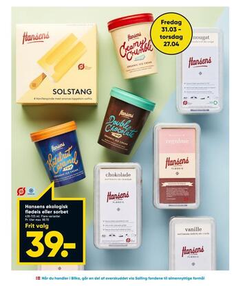 | Hansens økologisk flødeis, sorbet eller isvafler | Bilka | 38,00 kr. | 30 august 2024 | 05 september 2024 | |||
