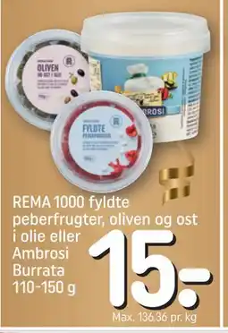 | Hummus trio, oliven og ost i olie eller fyldte peberfrugter 110-210 g | REMA 1000 | 15,00 kr. | 21 juli 2024 | 27 juli 2024 | |||
