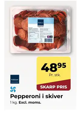 | 1 | Pepperoni i skiver 1 kg | Dagrofa Food Service | 48,95 kr. | 01 januar 2026 | 31 januar 2026 | Se tilbud | |||