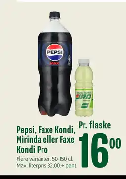| Pepsi, Faxe Kondi, Mirinda eller Faxe Kondi Pro 50-150 cl | Min Købmand | 18,00 kr. | 05 september 2025 | 11 september 2025 | |||