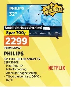 | PHILIPS 2025 55" 4K Smart Ambilight TV app Ambilight skaber imponerende effekter TV | Power | 6.999,00 kr. | 2.888,00 kr. | 4.111,00 kr. Rabat | 12 september 2025 | 02 oktober 2025 | |