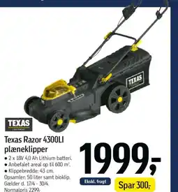 | Texas Razor 4300LI plæneklipper | Føtex | 2.299,00 kr. | 1.999,00 kr. | 300,00 kr. Rabat | 17 april 2026 | 30 april 2026 | |