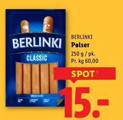 1Lidl BERLINKI Pølser tilbudBERLINKI Pølser 250 gLidl15,00 kr.18 januar 202624 januar 2026 Se tilbud