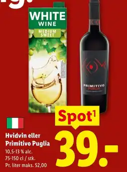 | 2 | Hvidvin eller Primitivo Puglia 75-150 cl | Lidl | 39,00 kr. | 03 maj 2026 | 09 maj 2026 | Se tilbud | |||