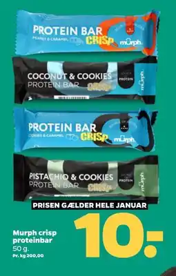 | Murph crisp proteinbar 50 g | Netto | 10,00 kr. | 01 januar 2026 | 31 januar 2026 | |||